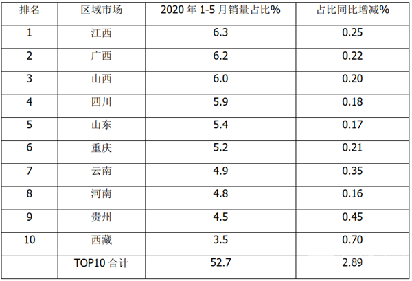 上表可见,2021年1-5月,农村客运市场区域流向不均,TOP10累计占比超半壁江山(52.7%),其中广西、江西、山西位居前三甲。TOP10占比同比均有不同程度的增加,累计占比增加3.38个百分点,其中西藏占比同比增加最大(增加了0.7个百分点),说明国家对西藏地区扶贫的力度是最大的。
