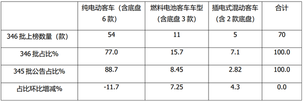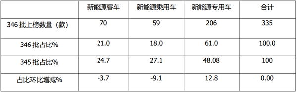 上表可见,在第346批公告中,新能源客车新品上榜70款,占比为21%,且占比环比减少3.7个百分点,是本批次新能源汽车上榜数量占比居于最小的细分车型(最大的是新能源专用车占比61%),也是占比环比下降第二大的车型。