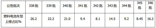 上表可见,在第346批公告中,纯电动客车(含底盘)上榜车型54款,占比77%,占据绝对的主导地位,占比环比减少11.7个百分点;而燃料电池客车上榜11款,占比为15.7%,环比占比增加7.25个百分点,为占比增加最大的细分车型。
