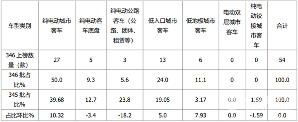 上表可见,在第346批新能源客车新品公告中,上榜最多的是纯电动城市客车,达到27款,占比半壁江山成(50%),说明纯电动城市客车依然是今后新能源客车的主打市场,且占比环比环比增加最大;其次是低入口城市客车,占比24.0%,但占比环比增加近5个百分点。