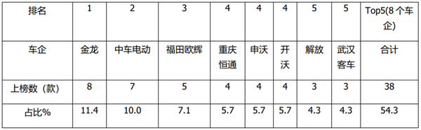 金龙客车客车上榜8款,位居榜首,占比11.4%;其次是中车电动上榜7款,占比10%;再次是福田欧辉客车上榜5款,占比均为7.1%;