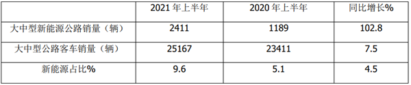上表显示,2021年上半年新能源公路客车累计销量2411辆,销量同比大增102.8%,远远跑赢上半年的大中型公路客车大盘(增幅7.5%),占据大中型公路市场的比重是9.6%,同比提高了4.5个百分点,有力促进了今年上半年大中型公路客车市场的增长。