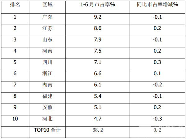 特点四、区域流向分布不均,主要扎堆在广东、江苏、山东等高速公路发达的区域市场;TOP10累计占比近7成,同比增加0.2个百分点