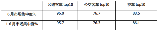 上表可见,无论是2021年6月还是1-6月,TOP10车企在公路客车市场的集中度都是最高的,其次是校车,再次是公交客车,说明了公路客车市场竞争最为惨烈,其次是校车,再次是公交客车。