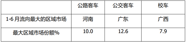 2、今年1-6月公交客车流向广东区域较多(占据行业的份额为12.6%),主要由于今年前5月深圳、广州、佛山、东莞、惠州等区域公交客车终端上牌数量较多所致;