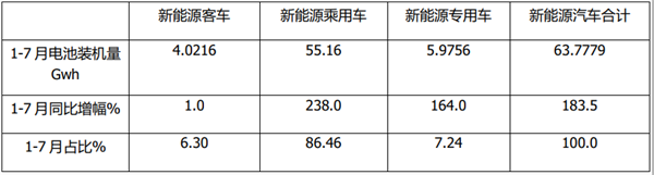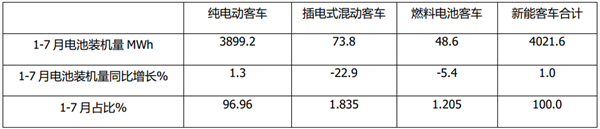 再次是燃料电池客车,装机量为48.6MWh,同比下降5.4%,占比为1.205%。也就是说,在今年前7月,燃料电池装机量同比仍然下降,说明燃料电池由于受成本高、加氢站不足、核心技术未突破、国家补贴不明朗等因素制约,很多车企处于徘徊状态,因此同比下降是正常现象。