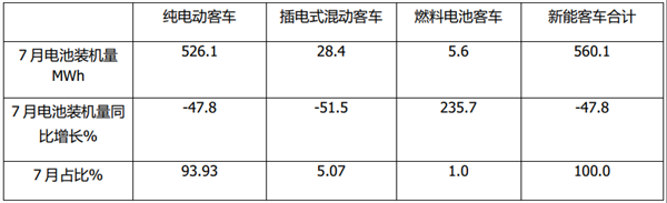 上表可见,在2021年7月,新能源客车动力电池装机量同比下降47.8%,在新能源汽车市场中,是同比唯一下降的细分车型(增幅第一大的是新能源专用车增幅255%,第二是新能源乘用车增幅161.5%),是新能源汽车中相对最“不给力”的细分市场;占比为4.96%,在新能源汽车市场中也居最小(第一是新能能源乘用车,占比超8成),从这也可看出今年7月新能源客车是新能源汽车中最不给力的细分市场,跑输新能源汽车大盘。
