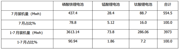 五、新能源客车装机量中(不含燃料电池),无论是7月还是前7月磷酸铁锂电池占比均占据绝对主体地位,其次是钛酸锂,再次是锰酸锂锂