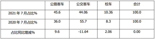 根据慧眼看车数据(扣除福田5-6米轻客产品),2021年7月公路、公交、校车占比及占比同比增减统计:
