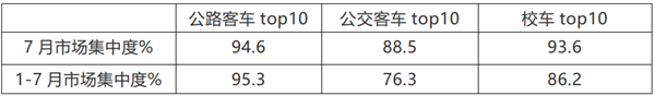上表可见,无论是2021年7月还是1-7月,TOP10车企在公路客车市场的集中度都是最高的,其次是校车,再次是公交客车,说明了公路客车市场竞争最为惨烈,其次是校车,再次是公交客车。