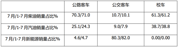 根据终端上牌数据(扣除福田5-6米轻客),2021年7月及1-7月5米以上公路客车、公交客车及校车三大细分市场中柴油、汽油及新能源占比情况统计: