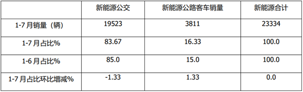 上表可见,在2021年1-7月新能源客车销量中,新能源公交占比83.67%,虽仍占据绝对优势,但环比1-6月下降了1.33个百分点;而新能源公路客车占比16.33%,环比1-6月提高了1.33个百分点,主要是由于7月新能源公路销量占比的提升带动的结果。
