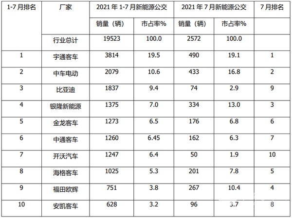 占比继续下降!2021年7月及前7月新能源公交客车市场特点解析