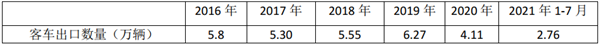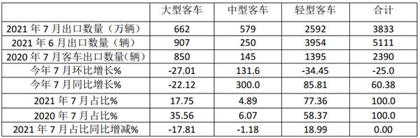 上表可见,2021年7月我国客车出口环比下降25%、同比出现了超6成(60.38%)的大增态势,说明: