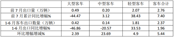 根据中汽协数据,2021年1-7月各细分车型客车出口同比、环比: