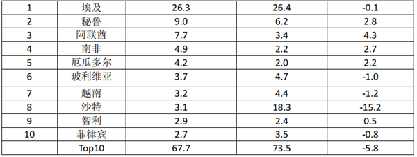 特点五、前7月我国客车出口流向埃及最多,其次是秘鲁,再次是阿联酋;从出口国市场份额同比增减看,阿联酋同比份额增加最多,沙特同比份额下降最多;TOP10累计占比67.7%,同比下降5.8%