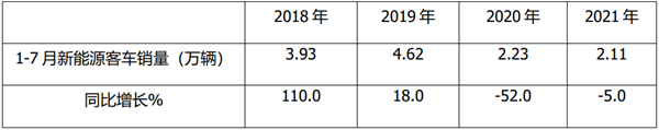 上表可见,2021年前7月新能源客车终端上牌销量为2.11万辆,比去年同期还少0.12万辆,在近4年同期中处于最低,同比下降5%,降幅在近年同期中居于第二,可以认为今年前7月新能源客车终端市场是近年最差、处于近年同期最为惨淡的年份,具体原因同上述一样。