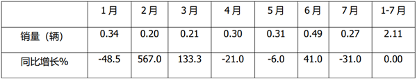 上表显示,在今年1-7月各月新能源客车终端市场中,6月销量最大为0.49万辆,2月同比增幅为567%,居于最高,在1-7月中没有一个月销量能达到0.5万辆,每月销量都不多。总体看,今年前7月新能源客车终端市场表现不尽人意;2月同比增幅高,是因为去年同期受疫情影响基数太低的缘故,并不是市场真实需求旺盛的表现。