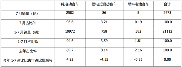 2021年7月及1-7月按技术路线划分,新能源客车销量结构(数据来源:上牌信息):