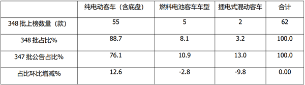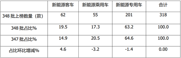 上表可见,在第348批公告中,新能源客车新品上榜62款,占比为19.5%,是本批次新能源汽车上榜数量占比居于最小的细分车型(最大的是新能源专用车占比63.2%),占比环比增加4.6%,也是占比环比增加幅度最大的车型。