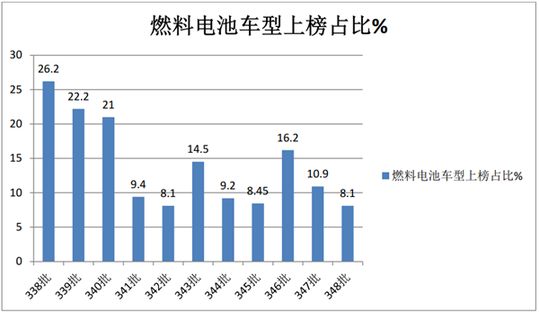 上图表说明,燃料电池客车在近期工信部发布的公告中,占比忽高忽低,波动较大,主要还是燃料电池客车目前的具体补贴政策不太明朗,车企有观望情绪,因此波动是正常现象。