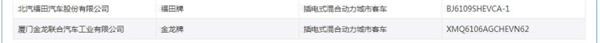 北汽福田和厦门金龙各1款插电式混合动力城市客车上榜。