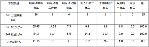 根据第348批公告数据,按目标用途划分上榜的55款(含8款底盘)纯电动客车车型类别结构统计: