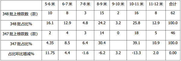 根据第348批上榜车型数据统计,各长度段上榜车型数量及占比: