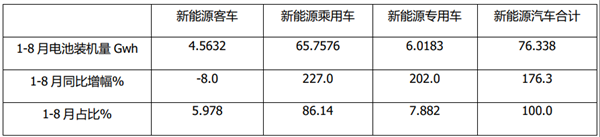 上表可见,在2021年1-8月,新能源客车动力电池装机量同比下降8%,是新能源汽车市场中同唯一呈现负增长的细分车型,增幅当然居于最小(增幅第一为新能源乘用车增幅227%,第二是新能源专用车增幅202%),也是新能源汽车中相对最“不给力”的细分市场;占比为5.978%,在新能源汽车市场中居第三(第一是新能能源乘用车,占比86.14%)。