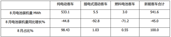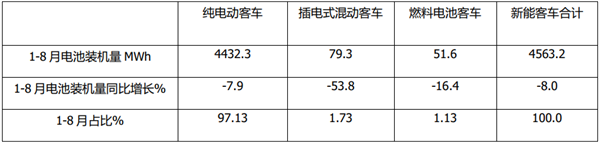再次是燃料电池客车,装机量为51.6MWh,同比下降16.4%,占比为1.13%。也就是说,在今年前8月,燃料电池装机量同比仍然下降,说明燃料电池由于受成本高、加氢站不足、核心技术未突破等因素制约,很多车企处于徘徊状态,因此同比下降是正常现象。