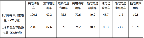 今年1-8月新能源汽车各细分车型的单车带电量中,纯电动客车单车平均带电量为238.5KWh/辆,也是为新能源汽车中单车平均带电量最高的车型。
