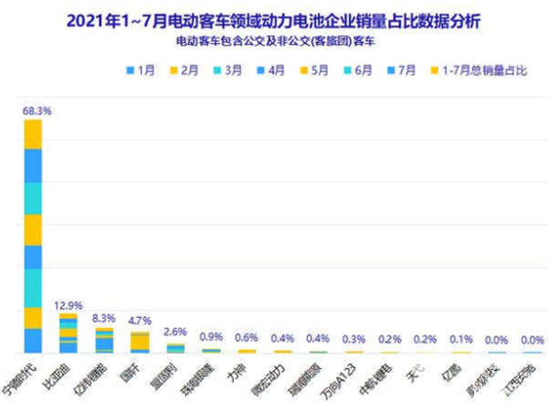 上图显示,在2021年前7月中电动客车动力电池TOP15电池销量占比中,宁德时代累计占比近7成(68.3%),一家独大;比亚迪累计占比12.9%,位居第二;亿纬锂能累计占比8.3%,位居第三。其余企业占比均在5%以下。