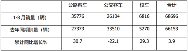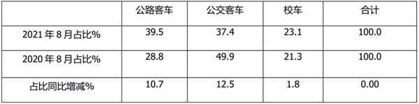 从上表可以看出,在2021年8月及1-8月客车三大细分市场中: