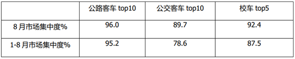 今年前8月累计市场集中度中,仍然是校车市场前5家占比达到87.5%,原因同8月基本一样。其次是公路客车,再次是公交客车。