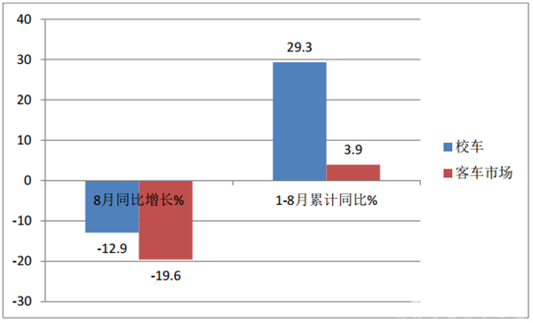 上图表显示,今年8月校车销量同比增幅-12.9%,跑赢8月客车大盘-19.6%近6.7个百分点;今年1-8月校车销量累计同比增幅29.3%,跑赢1-8月客车大盘(3.9%)近25.4个百分点。也就是说,无论是今年8月还是1-8月,校车市场均跑赢相对的客车大盘,成为拉动8月和1-8月客车市场增长的重要力量。