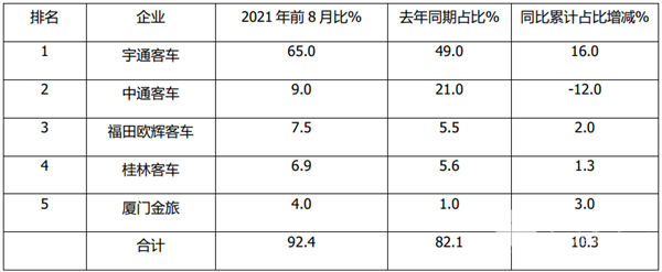 上表可见,2021年前8月校车销量TOP5企业校车竞争呈现的特征是: