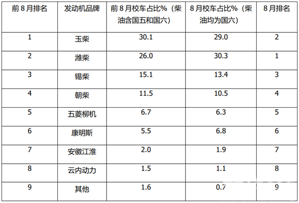 根据终端上牌信息,按校车发动机动力品牌划分,2021年8月及前8月校车销量结构统计: