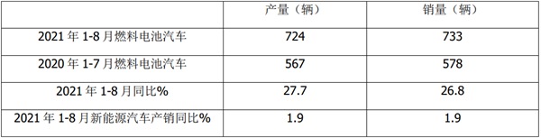 上表可见,2021年前8月燃料电池汽车累计产销分别为724辆和733辆,同比分别增长27.7%和26.8%,远远小于前8月新能源汽车的产销同比增幅(今年1-8月新能源产销同比增幅均为1.9倍)。也就是说,今年8月及1-8月燃料电池汽车产销均跑赢新能源汽车大盘。