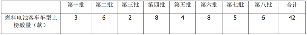 根据工信部数据,截止目前2021年累计发布的8批新能源客车推荐目录中燃料电池客车上榜车型数量统计: