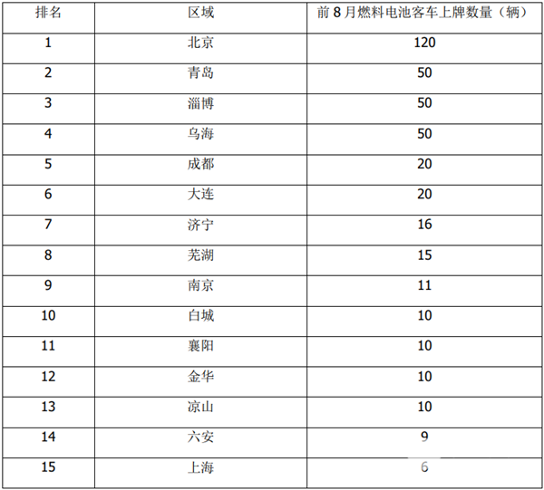 上表可见,在今年前8月,北京区域燃料电池客车上牌达到120辆,位居第一。