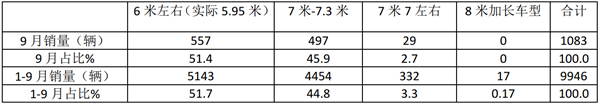 特征三、无论是今年9月还是1-9月,6米段销量均占比超半壁江山,占市场主导地位,其次是7米-7.3米段