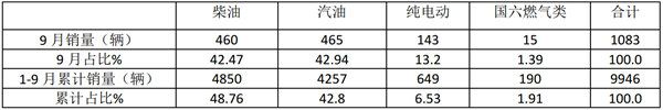 根据终端上牌数据统计,按燃料种类划分,2021年9月及前9月考斯特客车销量结构: