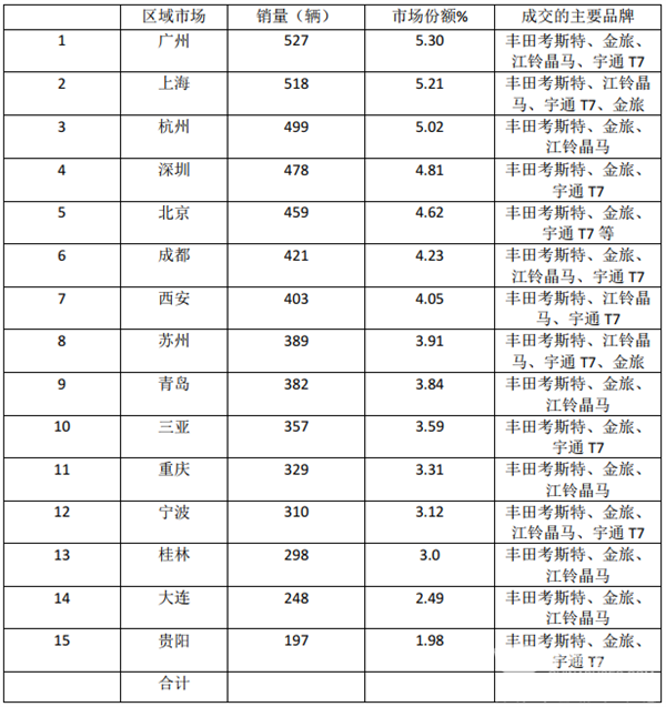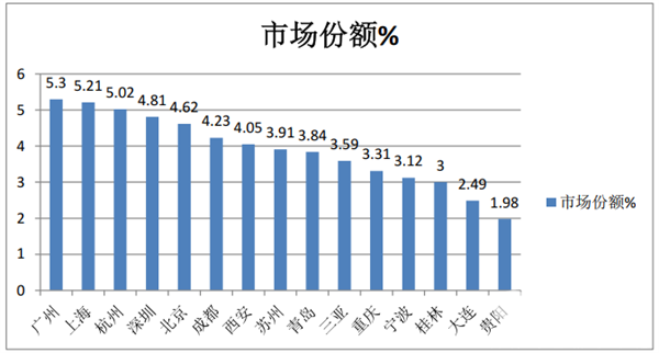 1、广州、上海、杭州、深圳、北京占据前5名,说明考斯特客车流向与区域经济实力有很大关系上、广、杭、深、北不但旅游经济发达,企事业单位也多,政府接待用车、企事业单位团体用车等几率最大,因此上、广、杭、深、北当仁不让占据前五。