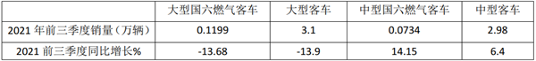 根据终端上牌及中汽协数据,2021年前三季度大中型国六燃气客车同比增幅与大中型客车大盘比较: