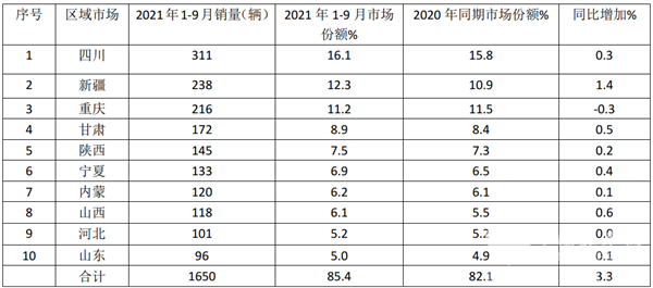 根据终端上牌信息显示,2021年前三季度国六天然气客车全国区域销量流向不均衡,主要销往四川、新疆、重庆、甘肃、陕西、宁夏等气源比较丰富、且加气站网点比较密的区域,各区域销量及占比如下表:
