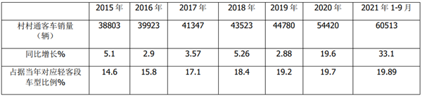 终端上牌信息显示,2021年前三季度及近年村村通小客运市场销量(含5—7米段)及占比统计如下: