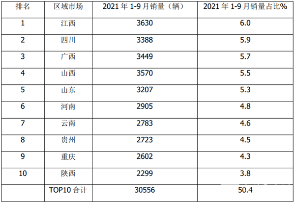上表显示,今年前3季度农村客车市场区域分布不均,江西、四川、广西占据前三甲,TOP10累计占据超5成的份额(50.4%)。