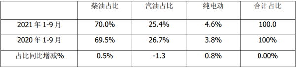 上牌数据显示,2021年1-9月及2020年同期,农村客运市场中销量占比最大的是柴油动力车型,其次为汽油。柴油占比7成,且同比增加0.5个百分点,纯电动占比最小,但占比同比提升0.8个百分点,为最快。