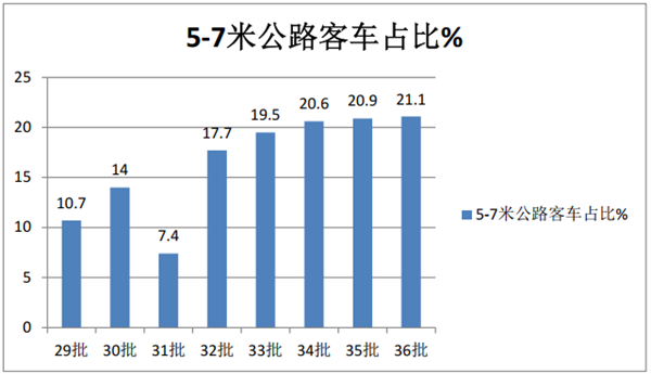 根据2021年交通部发布的共计8批(第29-36批)公路客运车型达标公告(截止到今年9月30日),5-7米农村客车车型占据总车型比例: