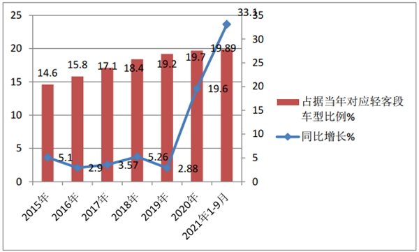 上图表可见,在2021年1-9月,农村客车市场销量60513辆同比增长33.1个百分点,在近年中增幅居最高;占据同类车型轻客市场的比例也达到了19.89%,也是近年最高的。也就是说今年前三季度无论是销量同比增幅还是占据轻客的比例,农村客车市场均创近年新高,这是今年前三季度农村客车市场一个较大的亮点。具体原因上文已经分析。